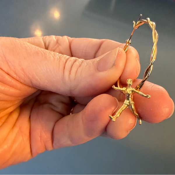 Zilver met 18 kt vergulde gedraaide oorring met danser (armen wijd) per stuk, niet per paar!